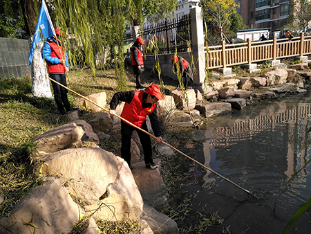 活動中,黨員志愿者們干勁十足、熱情高漲,發(fā)揚了不怕苦、不怕累、不怕臟的精神,清掃河邊垃圾、打撈河面落葉,一會兒,原本飄滿落葉的河道一角,變得干凈清澈了。