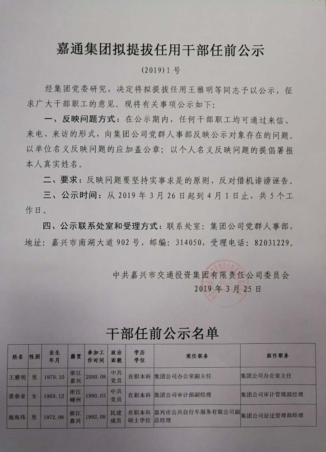 2019年1號(hào)嘉通集團(tuán)擬提拔任用干部任前公示