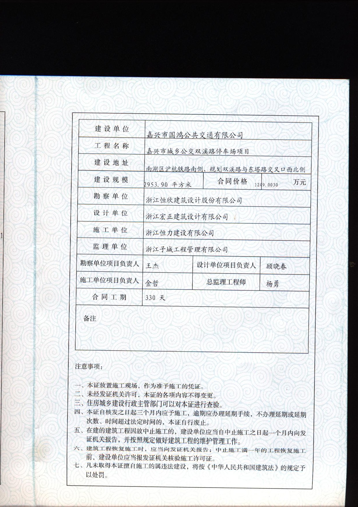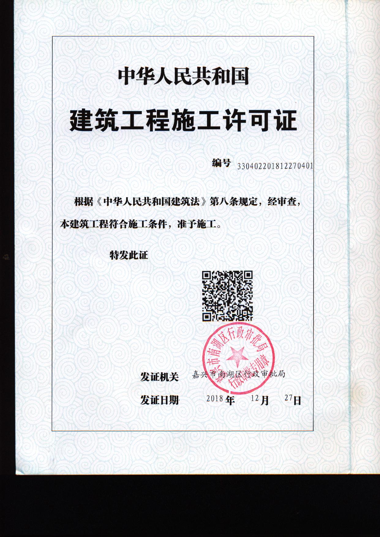 嘉興市城鄉(xiāng)公交雙溪路停車場(chǎng)項(xiàng)目建筑工程施工許可證